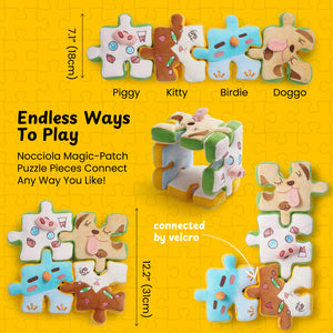 - Engage your dog's natural prey drive with our 4-in-1 puzzle dog toy! Four detachable animal pieces connect with strong Magic-Patch Velcro, creating a thrilling rip-and-tear action for endless, reusable fun.