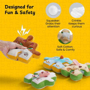 - Every piece is packed with both squeakers and crinkle paper. This symphony of captivating sounds stimulates curiosity and keeps your pup engaged for hours, satisfying their urge to chomp and explore.