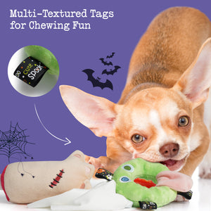 - Each dog toy contains a squeaker and crinkle paper for multi-sensory excitement. Whether your pup is “unmasking” the ghost snacks or sliding the skull along its rope, these interactive Dog & Puppy Toys for Boredom encourage physical activity and mental focus—ideal for high-energy or anxious dogs.