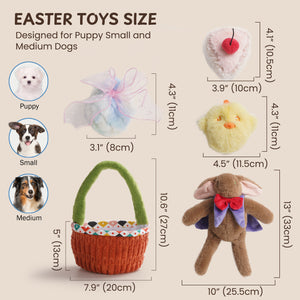 - This 5-pack dog toy set includes a rabbit, Easter egg, chick, small cake, and a basket. Each small dog toy features delightful Easter-themed designs that bring festive cheer to your dog's playtime.