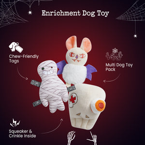 • These dog toys pack are designed in Halloween creepy theme, included pumpkin, skull, mummy, ghost, tombstone, coffin, bat, spider web, and potion shaped. Enrich your dog's Halloween and make it even more exciting!
