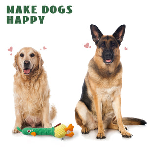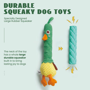 - The interior of the duck neck features a soft rubber squeaker, while the exterior is wrapped in several layers of crinkle paper and textured plush fabric. This funny, interactive dog toy won't harm your dog's dental health.