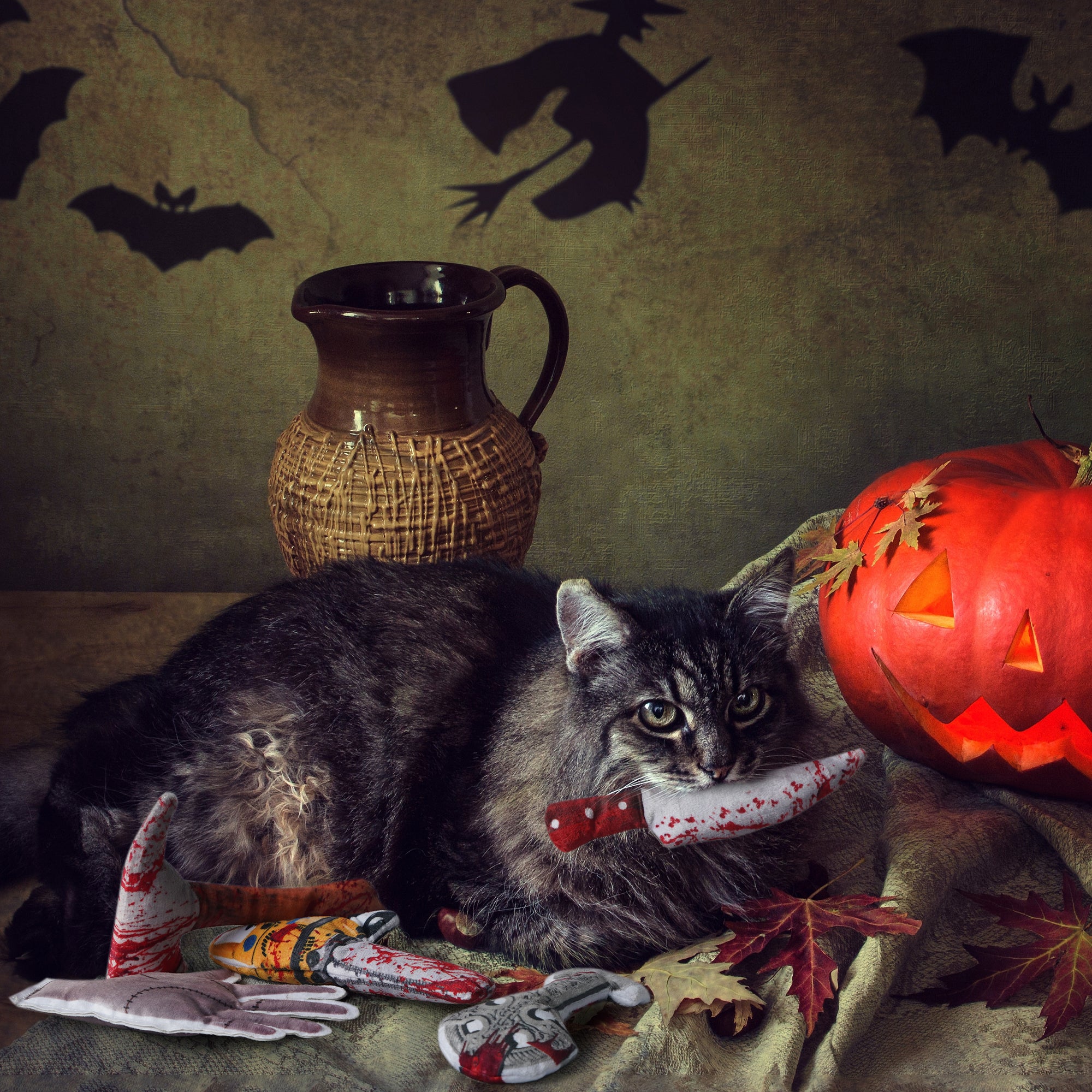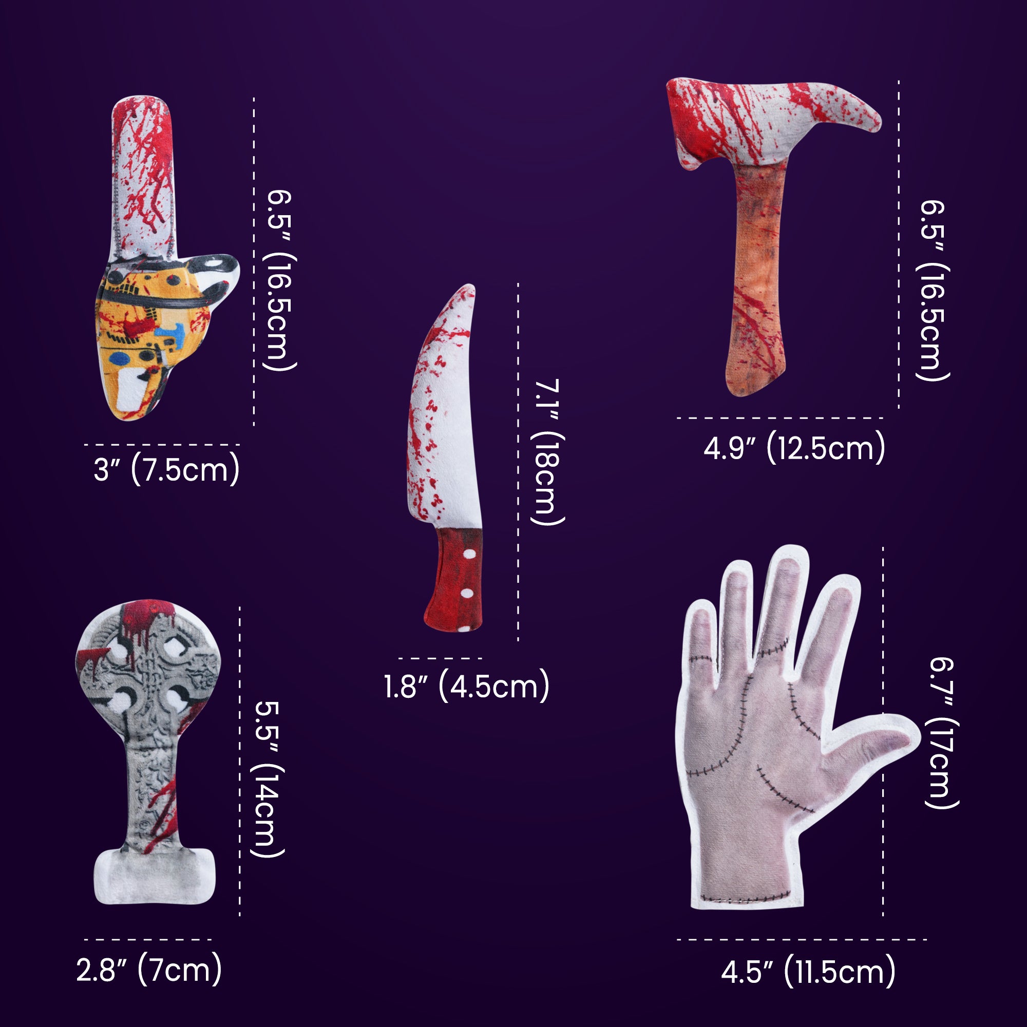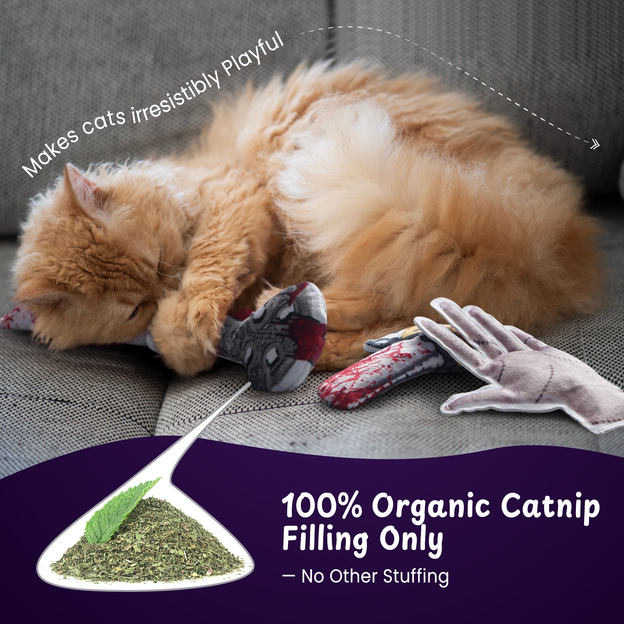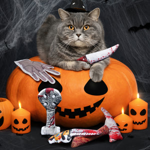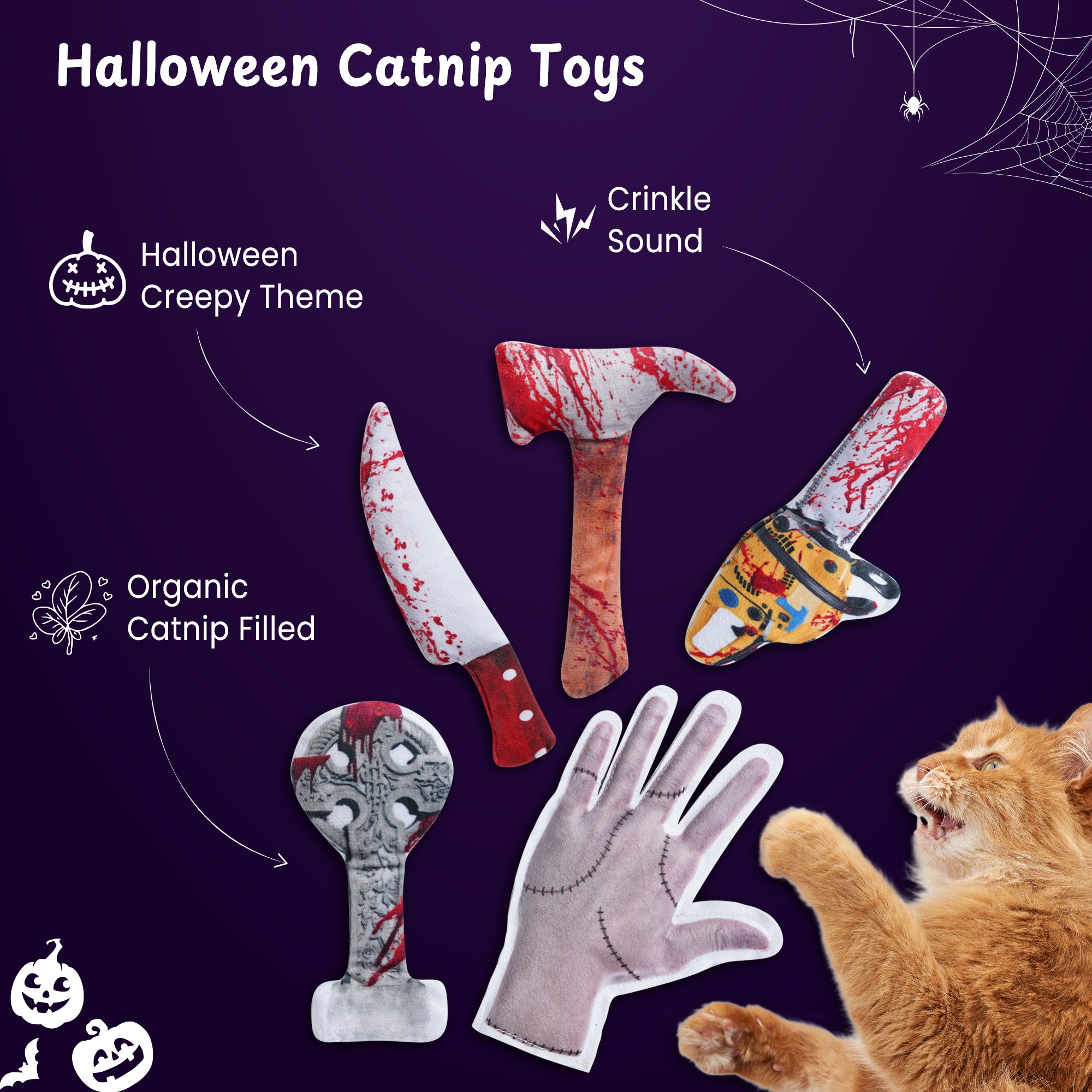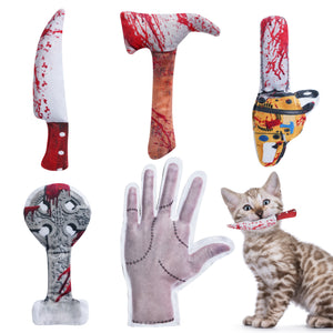 - These cute plush cat toys pack are designed in Halloween creepy theme, included Knife, axe, hand, chainsaw and tombstone shaped. crafted with safe, soft materials in exciting textures, these engaging kitten toys and cat toys for indoor cats encourage gentle biting, batting, and kicking, supporting healthy development and play habits.