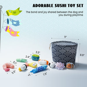 - Those plush toys with 10 different sushi-themed elements such as carp streamers and delicious rice balls. Sized to fit the paws and mouths of puppies, small dogs, and medium-sized dogs.