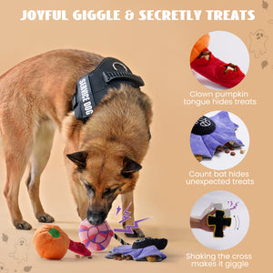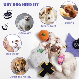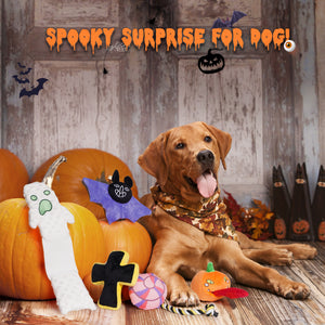 - This Halloween dog toy set features a fun and quirky design with pumpkins, ghosts, crosses, bats and candy, perfectly capturing the festive spirit. It offers your dog a unique and playful experience, making playtime even more exciting and memorable.