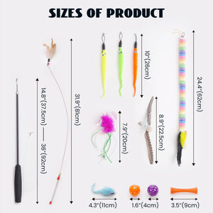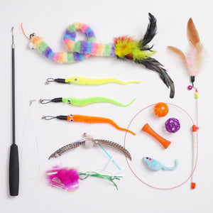 - This cat feather toy set contains a variety of toys that attract cats, 2 cat teasers of different lengths and styles, 3 short worm toys, 1 long worm toy, 1 butterfly, 1 mouse and 2 bell balls. A wide selection of toys can stimulate cats' curiosity and prey instincts.