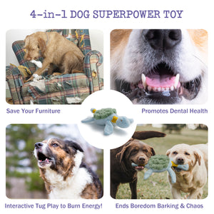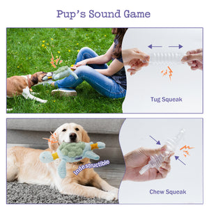 • This squeaky dog toy features a smart dual-squeaker design—chew-activated for solo play and tug-activated for interactive games.